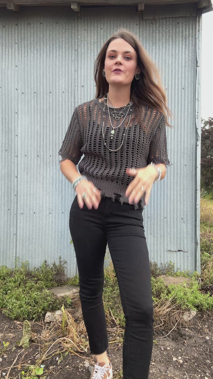 I love the edgy feel this blouse brings to the table. The charcoal crochet texture looks so stunning how ever you style it. Kelly is wearing a size small.