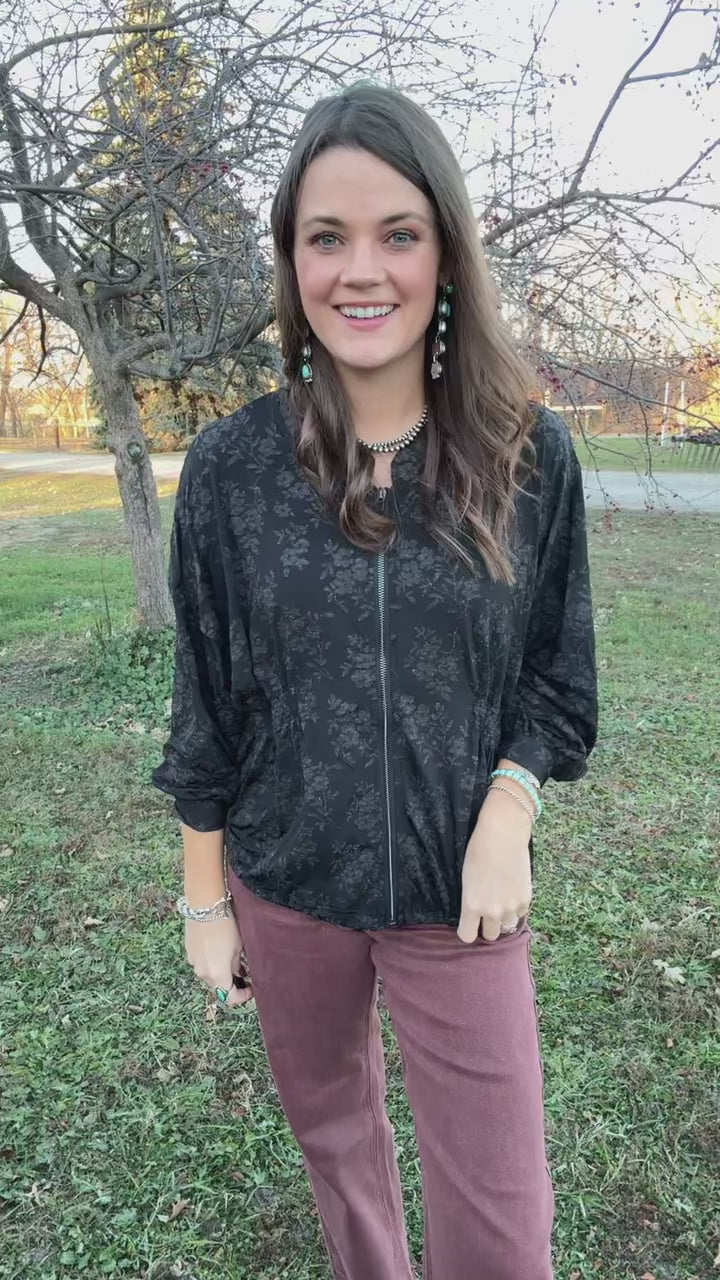 Classic and Timeless, this lightweight bomber is the perfect layering piece to add a punch of texture to your wardrobe! Whether you style it solo or layer it over a statement blouse and jewels it'll be a go to. Features a delicate floral texture and elastic waist.