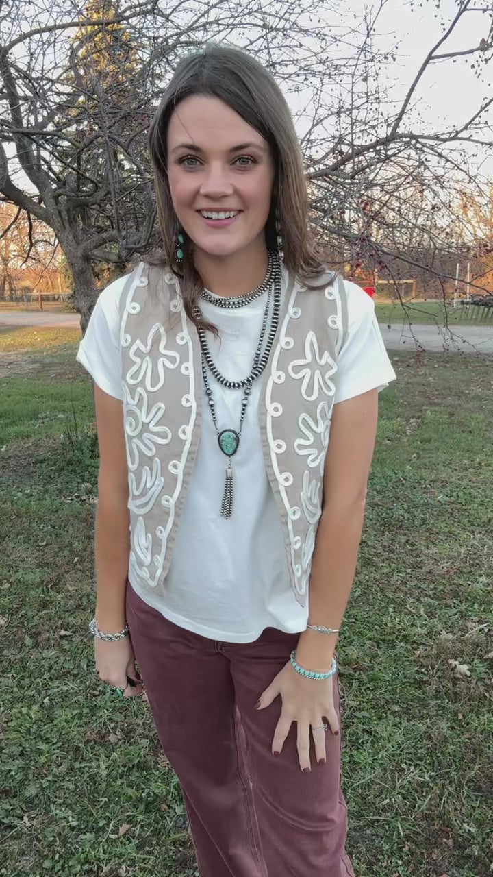 Layer on the effortless vibes. This boho-inspired vest features intricate cord embroidery and an open front design—perfect for elevating any casual look to the next level!