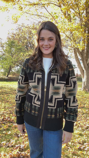 A bomber-style women’s fleece jacket featuring Pendleton’s iconic Harding pattern. Crafted in plush fleece with canvas trim and a full muslin lining, it blends comfort and durability. Details include a zip front, knit collar, cuffs, and hem, plus two angled pockets. With its soft silhouette and heritage print, this Harding fleece jacket offers sporty warmth and timeless Pendleton polish.