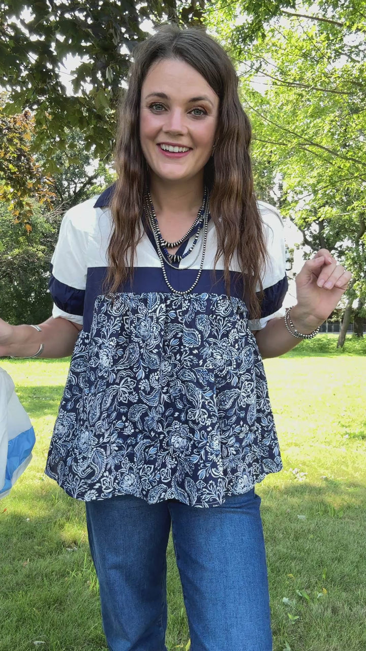 This darling top is bringing all the charm with its patchwork vibes! A crisp white base, bold navy banding, and a flirty floral pattern come together in perfect harmony—like a summer garden party with a dress code for cute. The gathered bodice adds a breezy, forgiving fit and the collar gives just enough polish to dress it up or down.