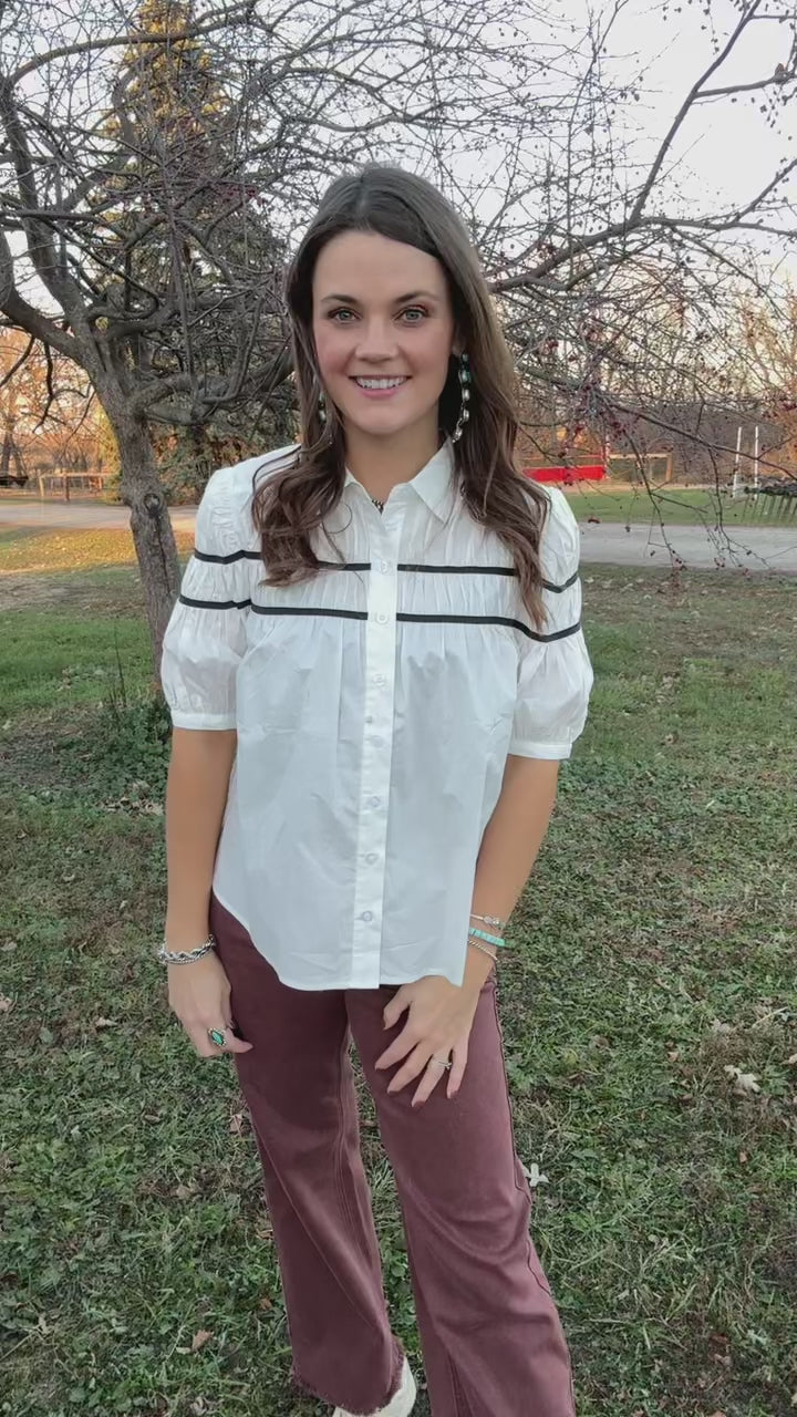 For the love of timeless western designs. I adore this blouse for being the perfect go to staple. A classic fit with a touch of elegance, the 100% cotton button down features short sleeves a pleated front with black stitching.