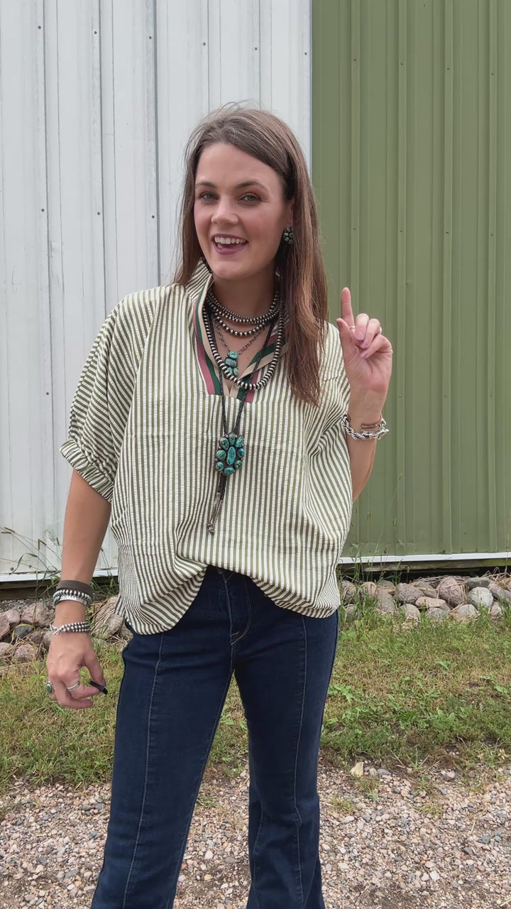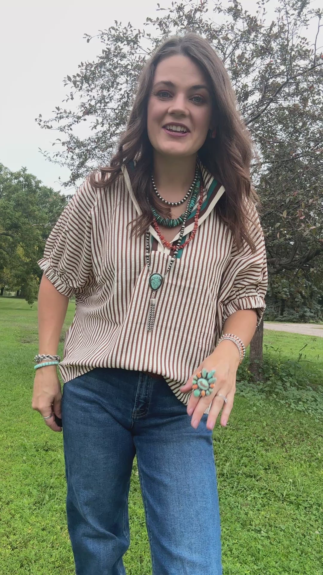 The best selling styles of blouse now in stunning Fall colorways. A simple stripe pattern features a high neck with multicolor ribbing for a pop of color.