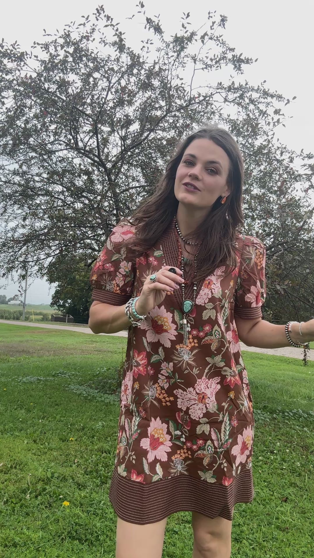 Simple yet stunning. This mocha based dress features an elegant Fall Floral print throughout. The stitched collar detail carries throughout the sleeve and base for an elevated look.