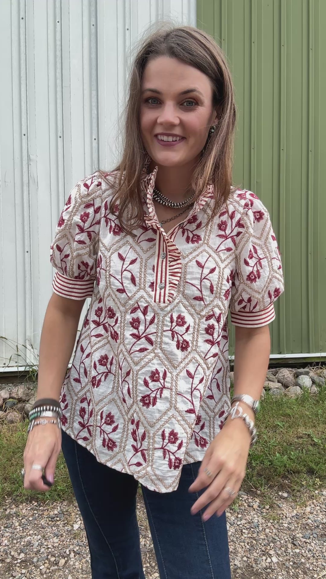 Stripe pattern high neck elasticated sleeve band dolman top featuring accented multicolor rib band split neck. Unlined. Woven. Non-sheer. Lightweight.