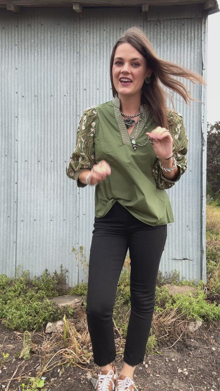 Stripe pattern high neck elasticated sleeve band dolman top featuring accented multicolor rib band split neck. Unlined. Woven. Non-sheer. Lightweight.