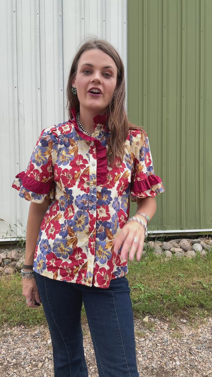 Floral print ruffle finish short sleeve top featuring contrast accent ruffle detail button front closure. Unlined. Woven. Non-sheer. Lightweight.