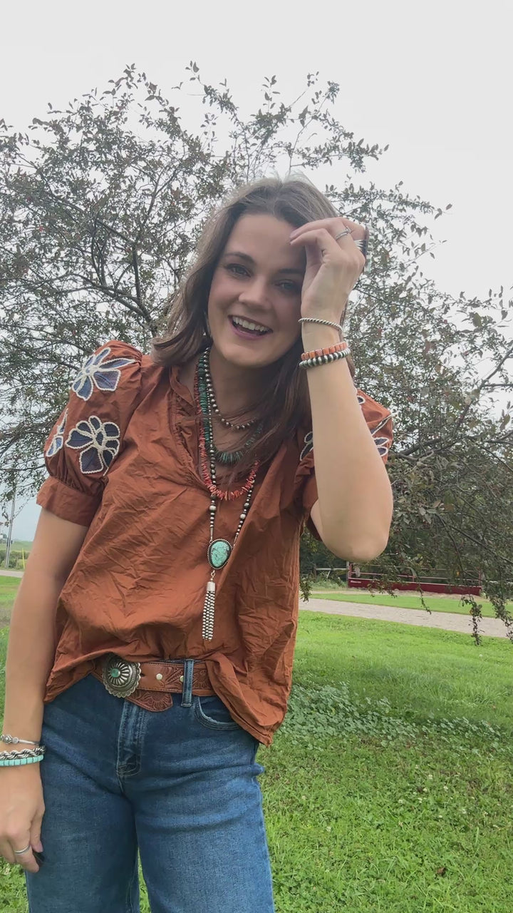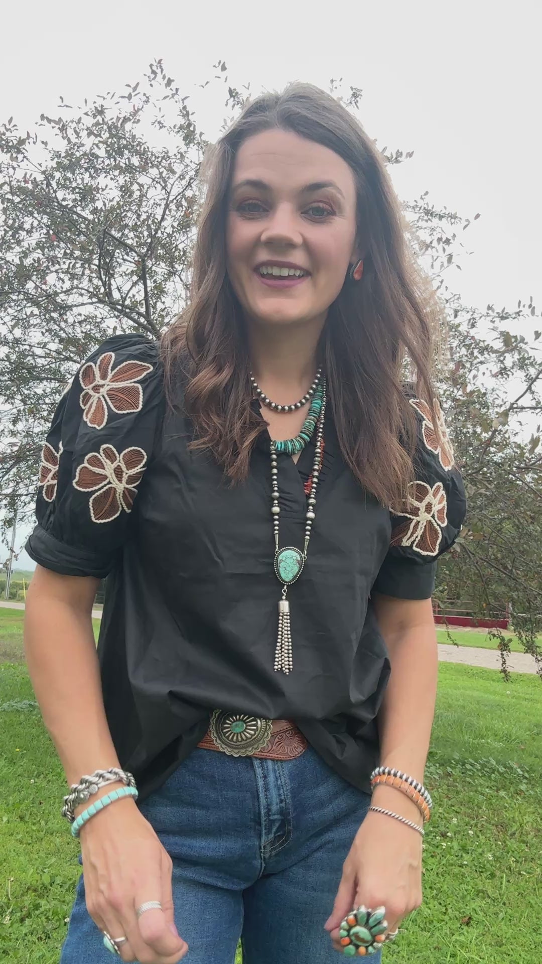 Solid ruffle accent V-neck top featuring floral embroidered applique short puff sleeve. Unlined. Woven. Non-sheer. Lightweight.