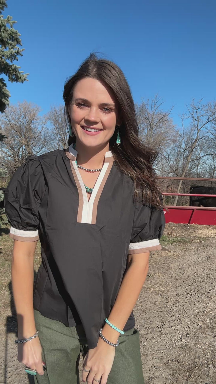 Another chic style that screams timeless elegance. The crisp black base with touches of white and brown make this a shirt you're going to grab over and over. It's an oversized fit that looks great with a front tuck! Kelly is wearing a size small.