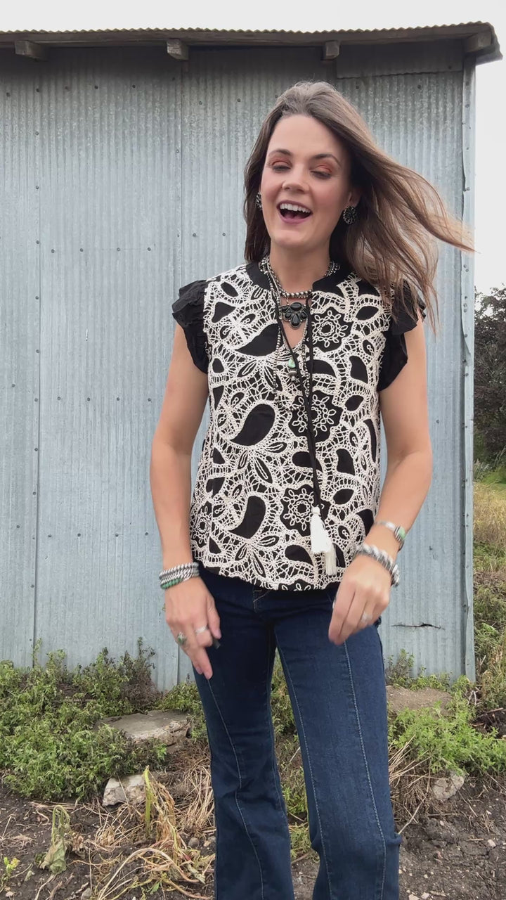 Black with a little lace detailing, what more could you want? The rich fabric is such a stunner whether you wear it solo or under a coat. Kelly is wearing a size small.