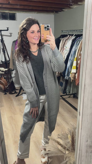 A two-tone striped cardigan with a subtle chevron pattern. I love how cozy this cardigan is! Has a nice oversized fit so don’t be afraid to try a size down if you want a slimmer fit!