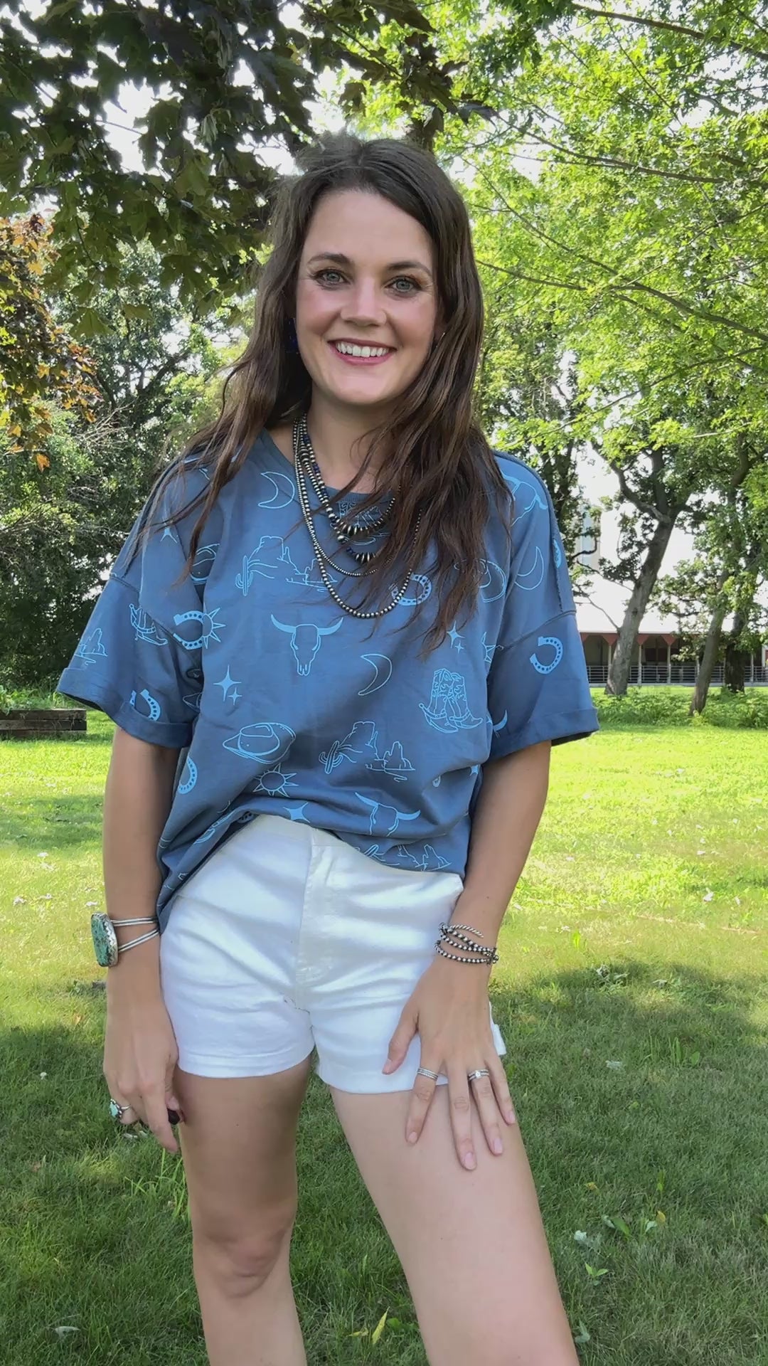 This tee is what dreams are made of! A super casual, but fun look for everyday wear. This oversized for tee features western graphics throughout.