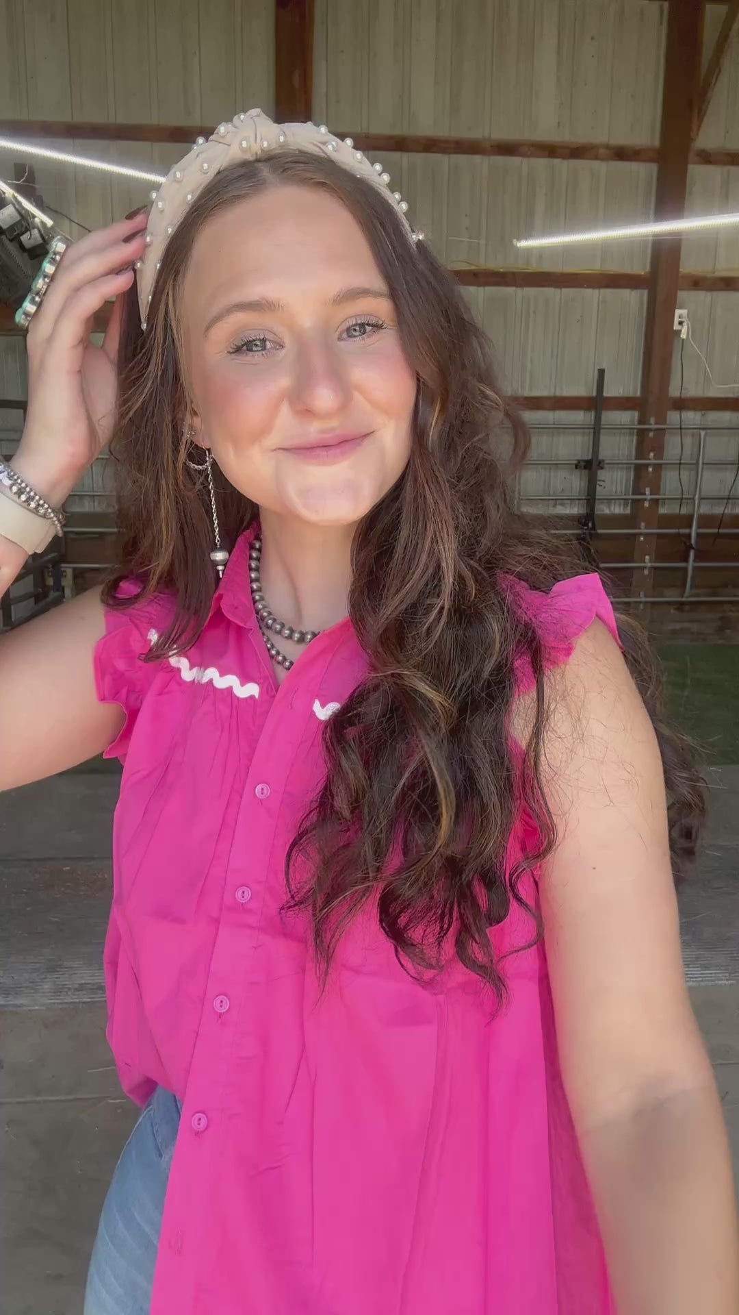 Why blend in, when you were born to stand out. This bright pink blouse has so many sweet features, from the slight ruffle sleeve the the delicate pleating throughout to the bright white wave stitch on the chest. The blouse packs a punch!