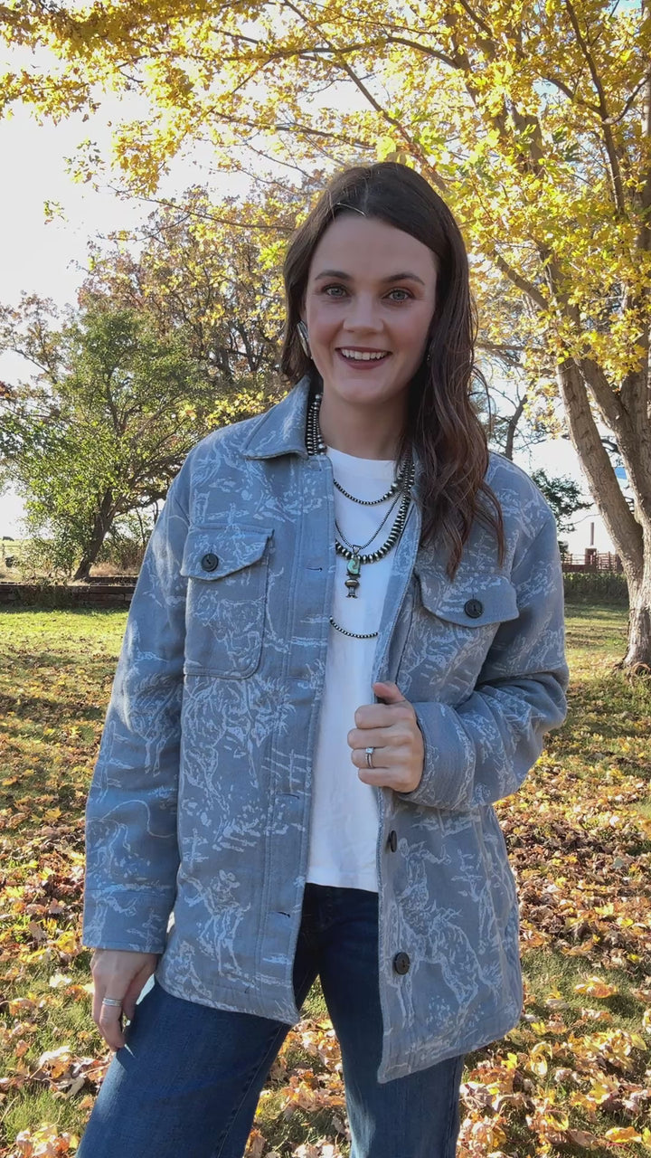 A modern take on the Western classic, this shirt jacket brings bold Pendleton style to everyday layers. Oversized and easy with slightly dropped shoulders, it's made with 100% DoubleSoft cotton chamois showcasing a scenic tonal horse pattern. Classic shirt details—button front, generous fit, curved hem—make this a versatile go-to piece.