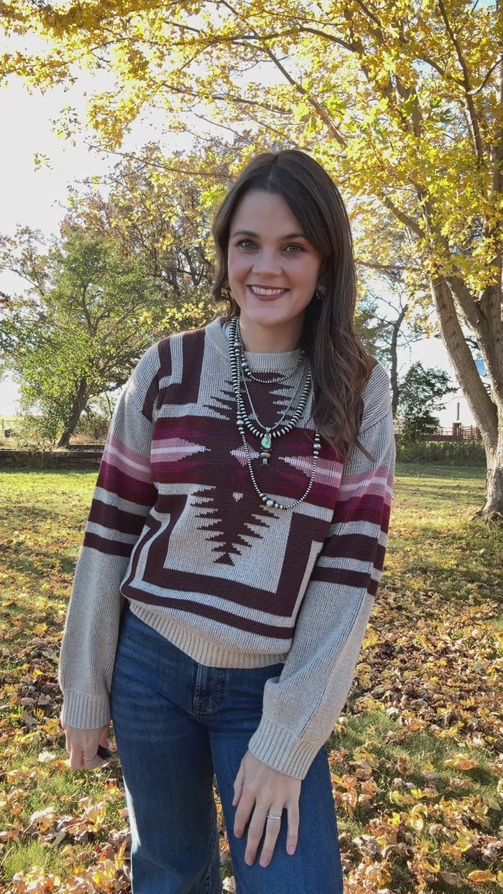 A soft cotton sweater with a placed jacquard pattern on front, back and sleeves. Features include a crew neckline, dropped shoulders, long sleeves and ribbed finishes. Lightweight enough for transitional wear.
