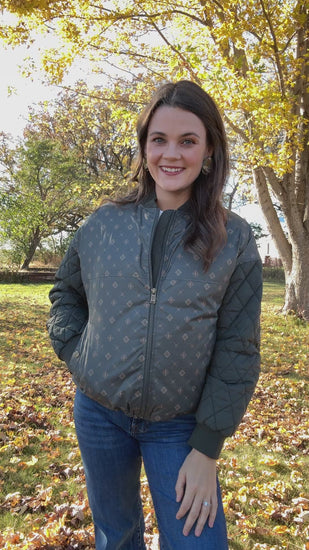 A new style from our favorite brand Pendleton, this jacket features a classy quilted fabrication in a stylish bomber silhouette. The timeless olive base features a rosin harding foulard pattern. The fit is classic, and the weight is perfect for Fall and Winter.